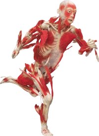 In de volgende ruimte kwam de eerste van een flinke serie compleet geprepareerde mensen. Nu heb ik al wat ervaring met lichaamsdelen op sterk water; ik heb in Nijmegen het anatomisch museum van de medische faculteit bezocht en ben zelfs al een paar keer in diens anatomiesnijzaal geweest om hersenen te ontleden, maar zo mooi en vernuftig als de "voorwerpen" in deze tentoonstelling had ik het nog niet gezien. Ook hier was de opbouw te herkennen. Meneer was net meer dan een skelet, met alleen wat extra spieren in zijn benen en armen. Later zouden de rest van de organen er stukje bij beetje aan toegevoegd worden. Ik geloof dat dit, samen met het skelet, ook de enige meneer zonder genitaliën was, want wat de conservatoren dan ook weg lieten om iets onderliggends te verduidelijk, zijn zaakje was altijd prominent aanwezig. De navel trouwens ook. De rode lijn van het verhaal wellicht?