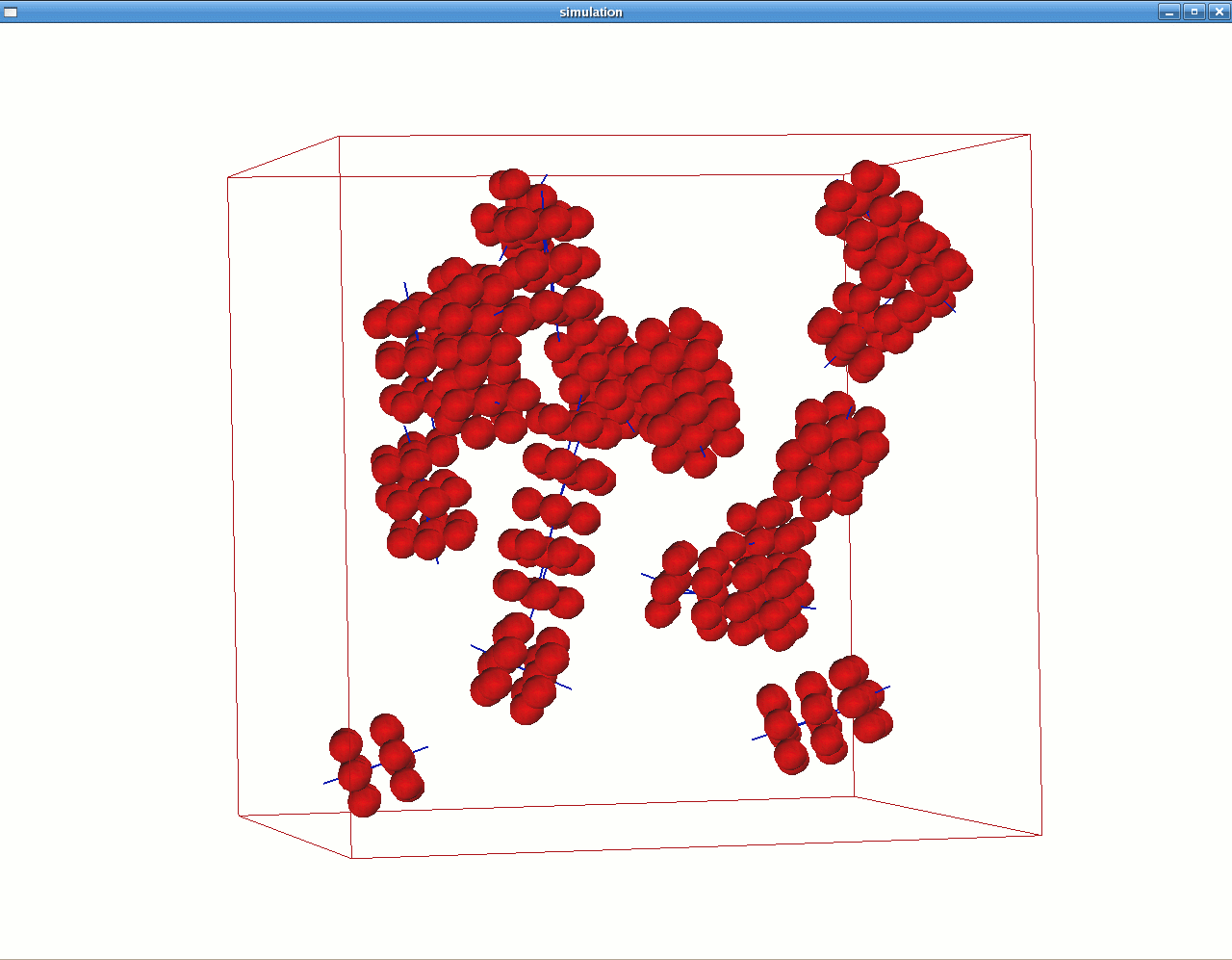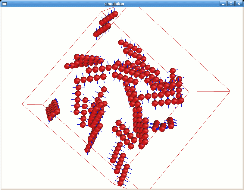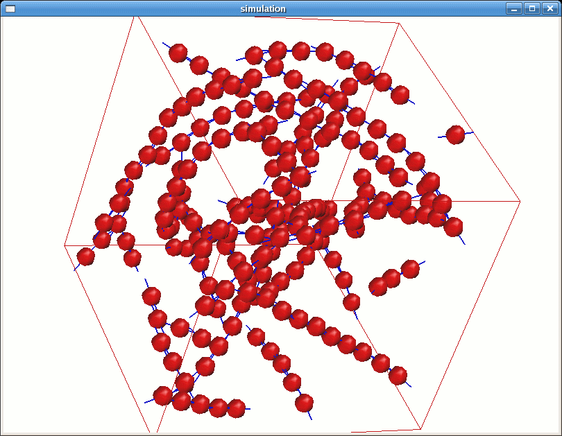Ik heb geprobeerd om in c++ een zo flexibel mogelijke Monte Carlo code te schrijven die rigide moleculen met richtingsafhankelijke interacties kan simuleren en dat is aardig gelukt. Sinds vandaag kan ik eindelijk ook zien wat mijn code doet: het wordt realtime, met nauwelijks invloed op de snelheid van de simulatie, weergegeven in een grafisch scherm